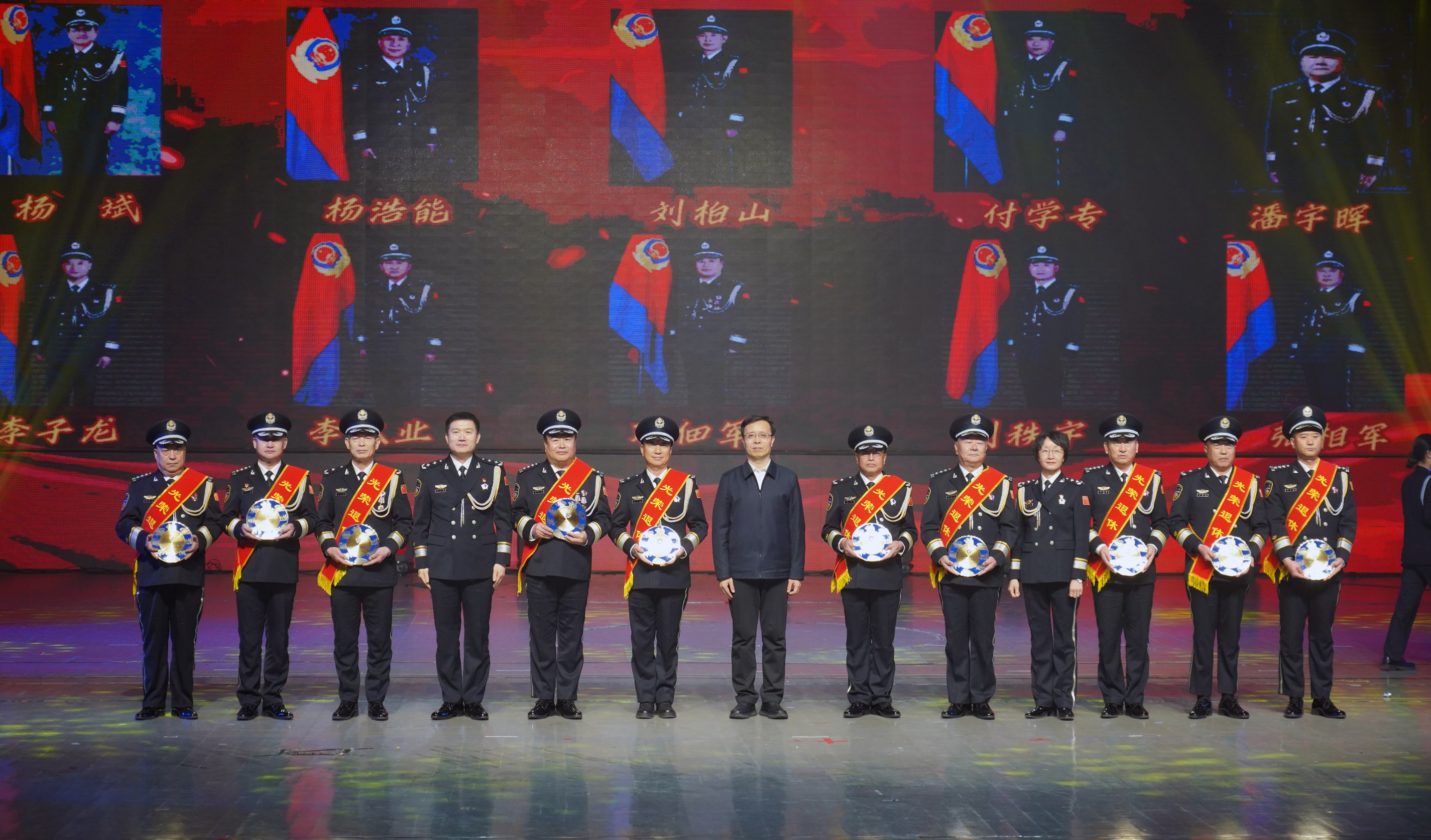 市委常委、政法委書記李曉波,省公安廳二級(jí)巡視員賈永華,市政府副市長(zhǎng)、市公安局黨委書記、局長(zhǎng)康海潮為退休民警頒發(fā)退休紀(jì)念盤
